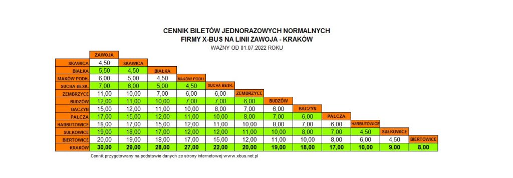 Dla podróżnych regularnie korzystających z usług firmy podwyżka ta może uderzyć po kieszeni. Ceny biletów na liniach Zawoja – Sucha Besk. – Kraków oraz Żywiec – Sucha Besk. – Kraków wzrosły od 50 groszy na krótszych odcinkach do nawet 5 złotych za jeden bilet na całej długości trasy! W nowym cenniku za bilet na trasie Zawoja – Kraków zapłacimy okrągłe 30 zł za bilet normalny (wcześniej 25 zł). Identyczna sytuacja ma miejsce na linii do Żywca. Tam za przejazd na całej trasie również za bilet normalny zapłacimy 30 zł (o 5 zł więcej niż wcześniej). Za bilet ze Skawicy do Krakowa zapłacimy teraz 29 zł (wcześniej 24 zł), z Białki – 28 zł (wcześniej 23 zł), z Makowa Podhalańskiego – 27 zł (wcześniej 22 zł). Mniejsza podwyżka dotknie pasażerów z Suchej Beskidzkiej, ponieważ Ci za bilet do stolicy Małopolski zapłacą „tylko” 22 zł (o 3 zł więcej niż dotychczas).