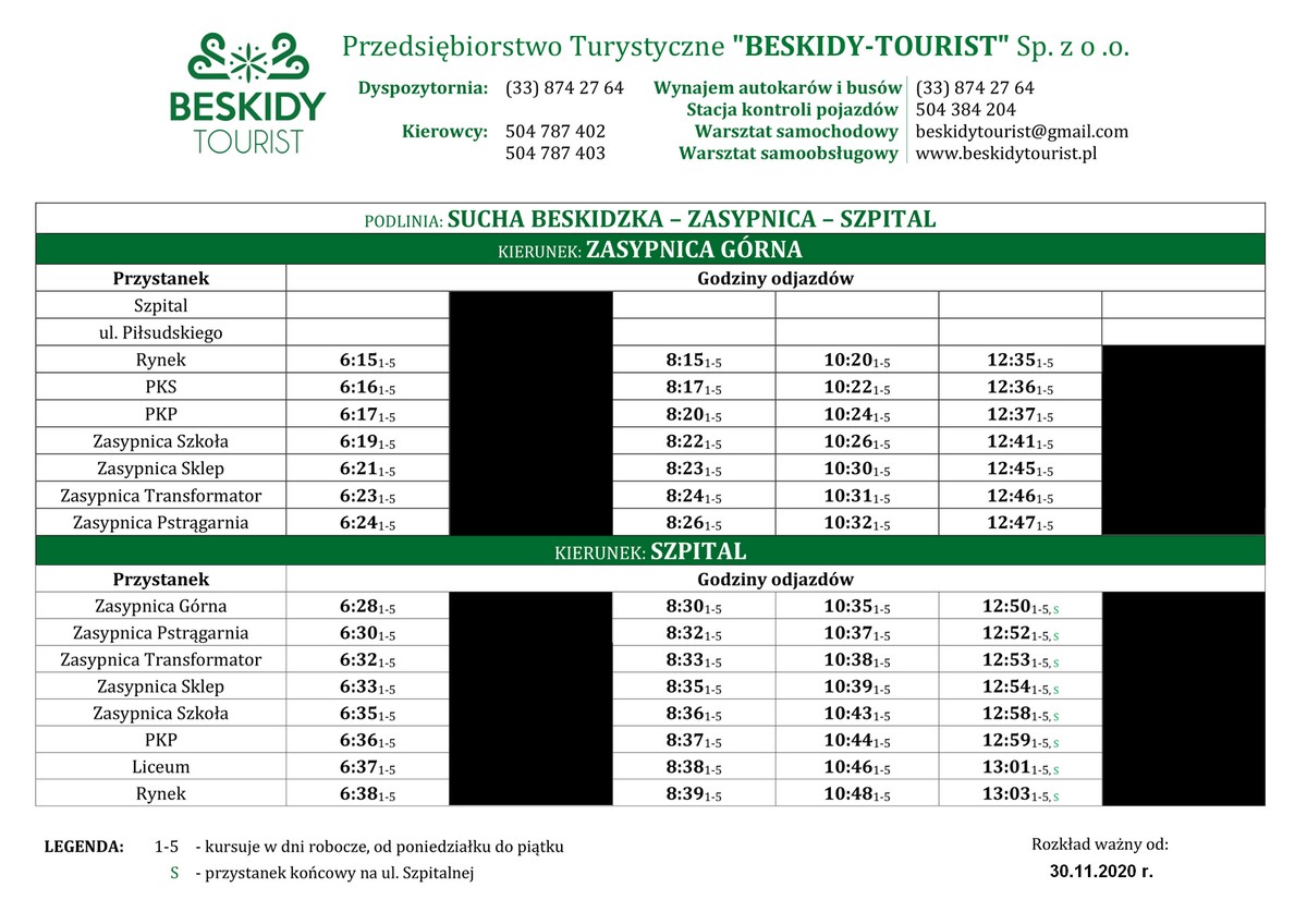 Tym razem ograniczenie dotyczy linii miejskiej w Suchej Beskidzkiej obsługiwanej przez Przedsiębiorstwo Turystyczne „Beskidy-Tourist”. Spółka informacje, że od najbliższego poniedziałku, tj. 30 listopada 2020 r. zawieszone do odwołania zostaną następujące kursy: