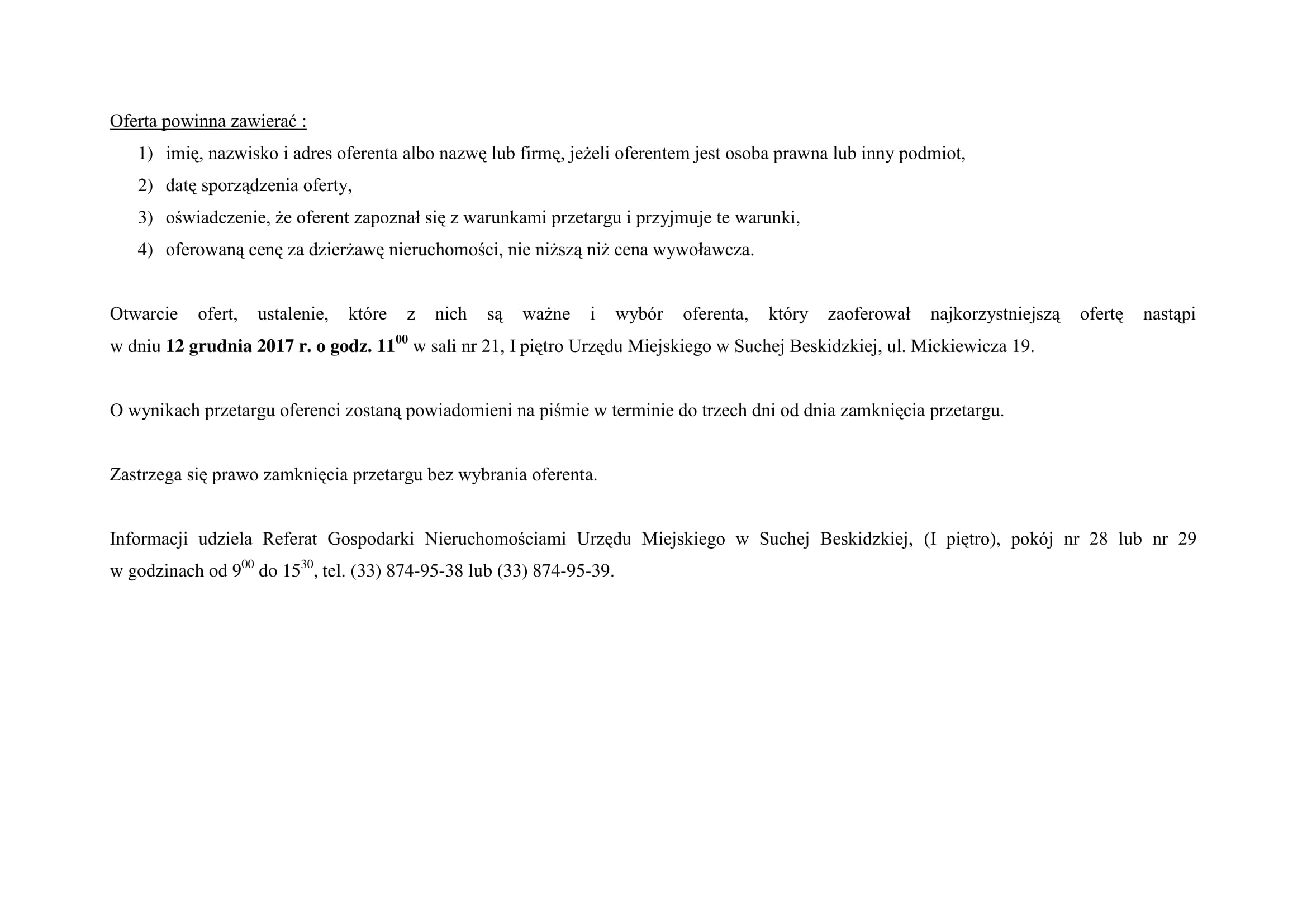 12 grudnia o godz. 11:00 miało nastąpić otwarcie ofert i wybranie najkorzystniejszej z niej. Niestety nigdzie nie pojawiła się informacja o wyniku przetargu. Nasza wiadomość skierowana do Urzędu Miasta Sucha Beskidzka również pozostała bez odpowiedzi, co może sugerować, że przetarg został nierozstrzygnięty.