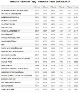 Dziennie realizowanych jest 5 par połączeń oraz dodatkowe szóste w niedziele. Busy wyjeżdżają z przystanku Sucha Beskidzka PKP o godzinach 4:50, 6:00, 11:20, 12:40, 15:20 oraz dodatkowo w niedziele o 18:10, a z Dworca Autobusowego w Katowicach o: 8:00, 9:30, 14:30, 15:50, 19:20 oraz w niedziele o 21:10.